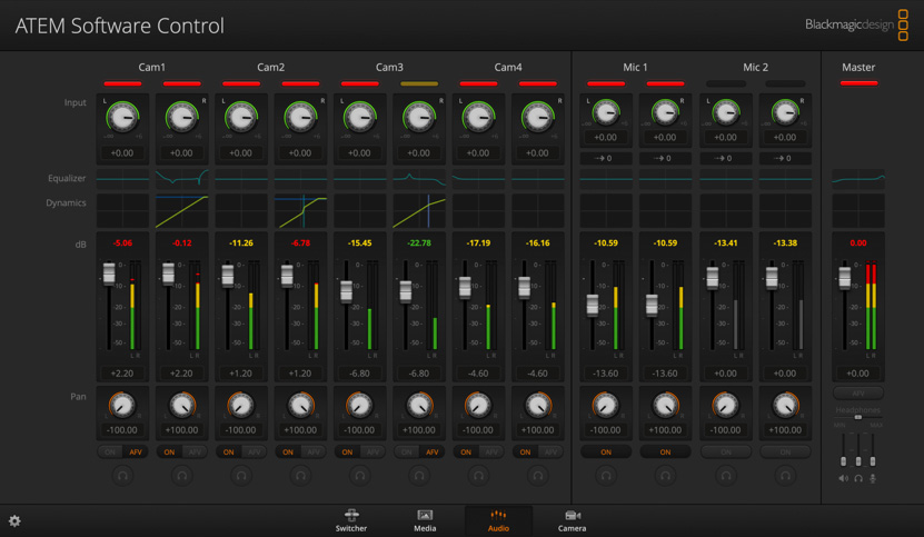 With a built in Fairlight audio mixer, ATEM Mini makes it possible to do complex live sound mixing. The internal mixer features enough channels for each HDMI input so you can mix audio from all sources! That’s audio from all HDMI sources and the 2 stereo mic inputs. Each input channel features the highest quality 6 band parametric EQ and compressor, limiter, expander and noise gate as well as full panning. You can even set up the software to auto mix between inputs as you switch “AFV” or to live mix multiple sources together all at once. All this audio power can be controlled via ATEM Software Control, or you can add a Mackie compatible panel or even a massive Fairlight Audio Console!