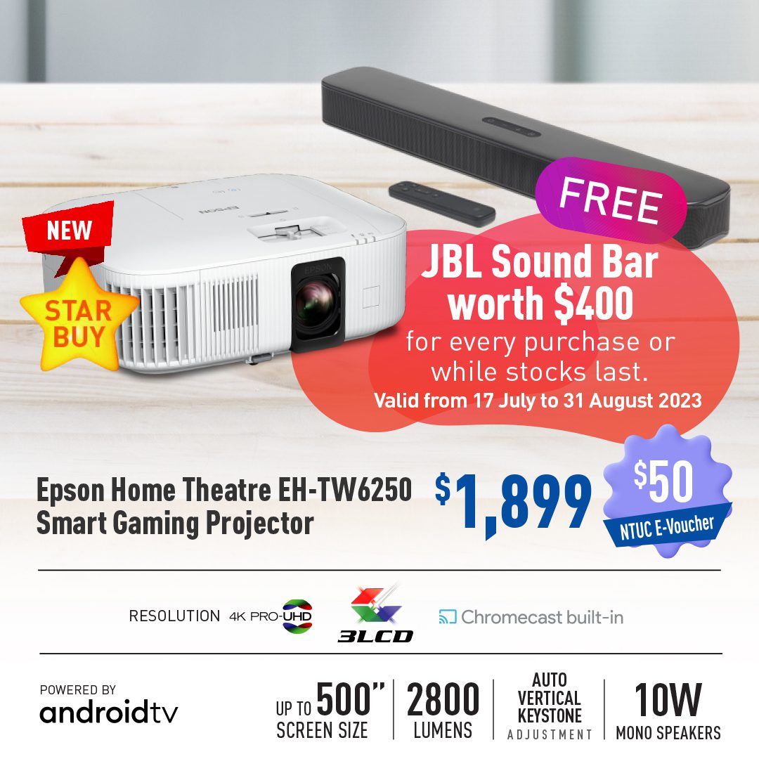 Epson Home Theatre EH-TW6250 4K PRO UHD Smart Gaming Projector At 1899 w/gst! FREE JBL Sound Bar worth $400.