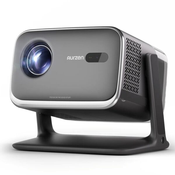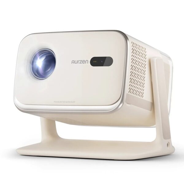 Aurzen BOOM Mini Smart Projector with 500 ANSI Lumens, Google TV, real-time autofocus, dual 10W Dolby speakers, Wi-Fi & Bluetooth.