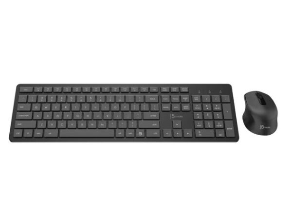 The JIKMW115 Full-Size Wireless Keyboard and Mouse is perfect for home or office use. It offers 2.4 GHz wireless technology with a 65 ft (20m) range for added portability and minimal desk clutter. Simply connect the USB™ receiver to your device and begin using the keyboard and mouse immediately. The ergonomic mouse is designed to fit the shape of your hand for comfortable navigation, while the keyboard features an integrated number pad for maximized efficiency. Intelligent Power Saving spares you the hassle of frequently changing batteries—up to 12 months for the keyboard and 6 months for the mouse.